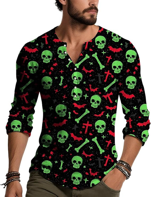 Men's Vintage Washed Skull Graphic Henley Shirt Long Sleeve Slim Fit Button Neck Streetwear Punk Rock Top